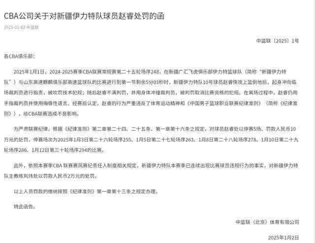 那么,付政浩老师说的国手是谁呢?沿着他给的路径,我发现,原来是在说赵睿。在2025年1月1日的元旦大战上,当时还在新疆男篮效力的赵睿,对于判罚不满,直接拿身体冲撞裁判,看起来就是故意的。篮协对此给出的处罚是:赵睿禁赛5场,罚款10万元。