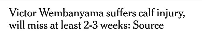 据球队透露,文班亚马的伤病发生在107-109不敌勇士队的比赛中。他坚持打完了那场比赛,但因左小腿紧绷,缺席了马刺队对阵国王队的后续赛事。