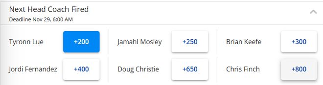 鹈鹕的威利-格林成为本赛季第一位正式被炒的主教练(注:比卢普斯仍在调查中,尚未被解雇),那么下一个丢掉饭碗的主教练会是谁?北京时间11月20日,相关赔率出炉,快船主帅泰伦-卢成为下一位被炒主帅的头号热门,排名第二的是魔术主帅莫斯利,位居第三的是奇才主帅基夫。以下是前六具体排名和赔率——