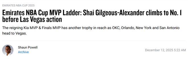 NBA杯MVP排名更新:亚历山大升至第一 尼克斯双星杀入前五