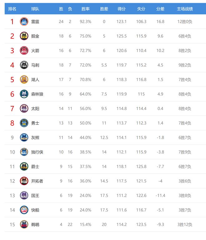今日比赛后西部只有马刺、湖人排名互换,其他球队排名不变。