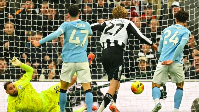 第63分钟,场上的僵局终于被打破,纽卡斯尔前场抢断,接到乔林顿的传球,巴恩斯一蹴而就,多纳鲁马无能为力。