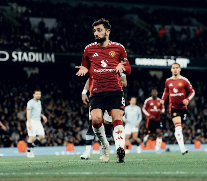 当然,中前场也有“传统艺能”。队长B费标志性的摊手动作早已成为个人Logo。但2024年曼市德比他将其升华,进球后双手一摊,顺利过关。这记“摊手庆祝”与那场绝地逆转一道,成为了历史经典。