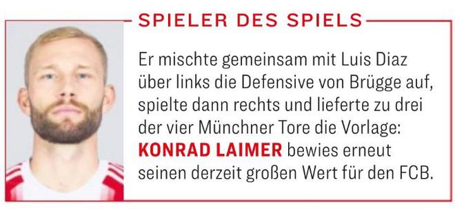 值得一提的是,德国著名杂志《踢球者》将莱默尔评选为拜仁4-0大胜布鲁日的全场最佳球员,并且写道:“他与路易斯·迪亚斯在左路搅乱了布鲁日的防线,随后又切换到右路,并为拜仁四粒进球中的三球送出助攻。莱默尔再次证明了自己目前对拜仁的巨大价值。”